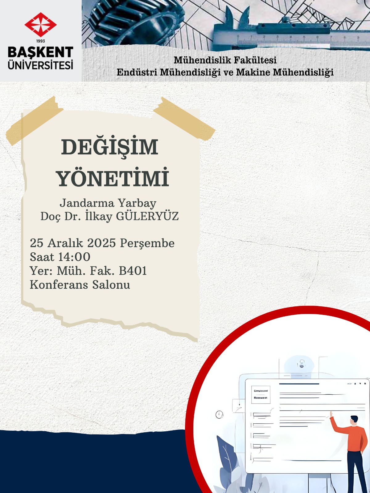 Başkent Üniversitesi Mühendislik Fakültesi, Endüstri Mühendisliği ve Makine Mühendisliği bölümlerinin katkılarıyla akademik bir etkinliğe ev sahipliği yaptı. "Değişim Yönetimi" konusunun ele alındığı seminere konuşmacı olarak Jandarma Yarbay Doç. Dr. İlkay Güleryüz katıldı.